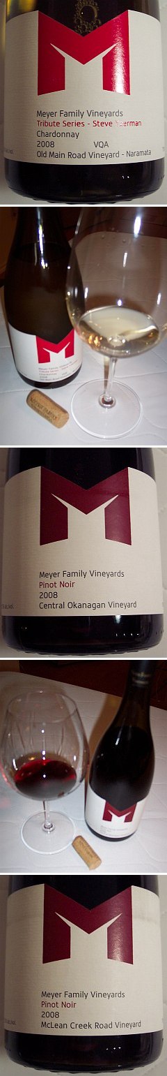 One of the first reviews I wrote was for the inaugural release of Meyer Family Vineyards‘ wines. I now have the pleasure of being presented with the latest, soon-to-be, release of their 2008 Chardonnay and 2 Pinot Noirs. For those unfamilar with the Meyer Family Vineyards, they are located on the Naramata Bench in the Okanagan. They produce a small number of cases of high quality wine each year.