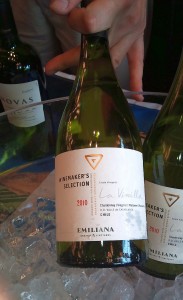 Emiliana Winemakers Select Chardonnay blend 2010 Canepa Reserva Privada Sauvignon Blanc 2011. Pale lemon. Medium intsity aromas of gooseberry. Not overpowering. High acid with asparagus and green flavours, with jalapeno peppers on the mid-palate. An elegant wine.