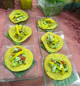 It is always nice to try wine with food. This year we were treated to some appetizers from Lolitas south of the border cantina (located at 1326 Davie St.). One appetizer was a Chicken Empanada. The empanada, a little baked bread pocket, was filled with smoked chicken, roasted yam, poblano chile, and white cheese. I liked the smokiness of the empanada and paired it with the rose. The other appetizer was a Ceviche using ocean-wise seafood, topped with a citrus and chile pepper, guacamole and pickled chayote, all stacked on a crisp corn toastada. This had outstanding flavour; with the citrus and guacamole flavour, and the textures of all the elements. I had to have a few of these.