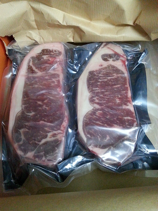 I received two 1″ thick Strip Loin steaks from Fuego Diablo Premium Steaks, via courier, to review. Shipped in a very masculine looking black box, surrounded by dry ice, and that all packed inside a styrofoam box and then a cardboard box. The steaks were well frozen when they reached my door. Fuego Diablo is serious about their steaks, and they provide you with a sheet describing how to properly thaw the steaks, lightly spice (they don’t really think it’s needed), and then to grill them.