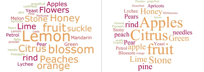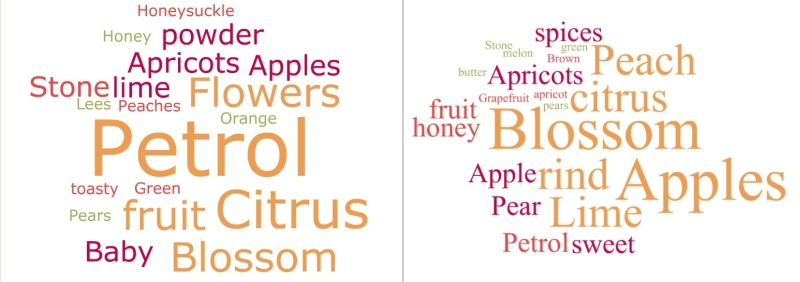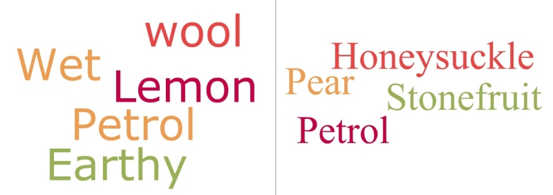 What immediately jumps out as a difference between these 3 soil types is how prominent petrol is as an aroma for the EEB soil type. Lemon, citrus, and blossom are common to all three. Apricots are more prominent for EEB while peaches are associated with OBC. Stone fruit is not expressed as much for ODBC, but apricots are most mentioned. Honey suckle is more prominent for OBC, but does show up to a lesser degree with EEB.