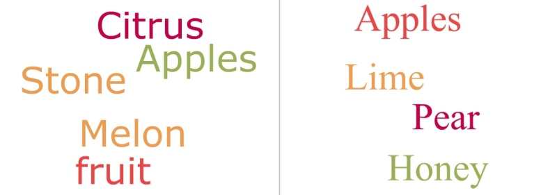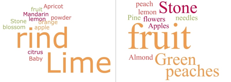 Stone fruit flavours are common to all three soil types. EEB soils seem to express blossoms more than the other two soils. Citrus is very prominent for OBC soil. OBC and ODBC are related soils, and we do see that stone fruit and green fruits are mentioned together.