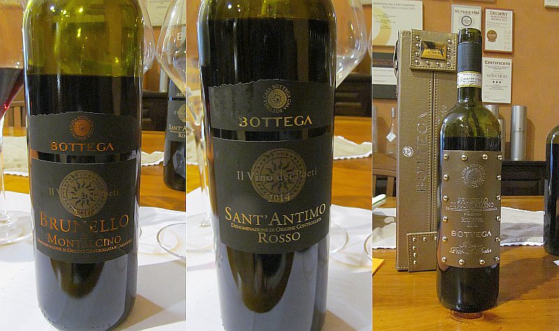 Bottega Brunello di Montalcino Riserva 2010 DOCG – This wine is their top level Brunello, made in the same manner as their other Brunello di Montalcino DOCG, but has one more year of barrel aging. The other thing that distinguishes the wine is the packaging and label of the wine. The winery owner, has a relationship with a fashion designer, who made a faux leather label, encrusted with steel studs, and then a custom wine box, also in the faux leather, metal studded. Pret a Porter is on the box. So very fashionable, and very limited in production. This is the wine, which I had the chance to retry after a day of decanting, and it did indeed make the wine taste richer.