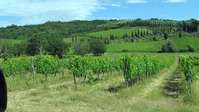 A very wine knowledgeable lady, Irene, from Bottega Spa shared lunch and wine with me, and took me to their vineyards and winery for the tasting. The vineyard is managed by another family, who have been growing grapes for many years. Lucca, the son of the owner, drove us in his 4×4 truck, through the vineyard, pointing out the ages of the vines, which varied between 5 and 45 years, the soil, which had at least 3 different types (one of which is called galestro – schist-based – and is said to be the best soil for Brunello di Montalcino), and described how they manage the vines for any pests or diseases that may affect the vineyard.