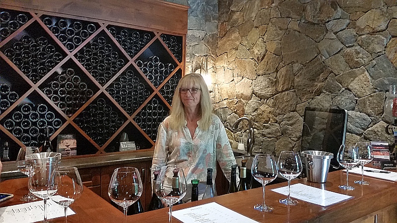 Debbie Woodward preparing to pour wines for us to taste at Privato Winery Privato Vineyard & Winery The Rise Pinot Noir 2016. Nice raspberries and spice and vanilla nose. More on palate. Finished with red cherries. Med body and acid. Dry. Long length. Fine tannins.