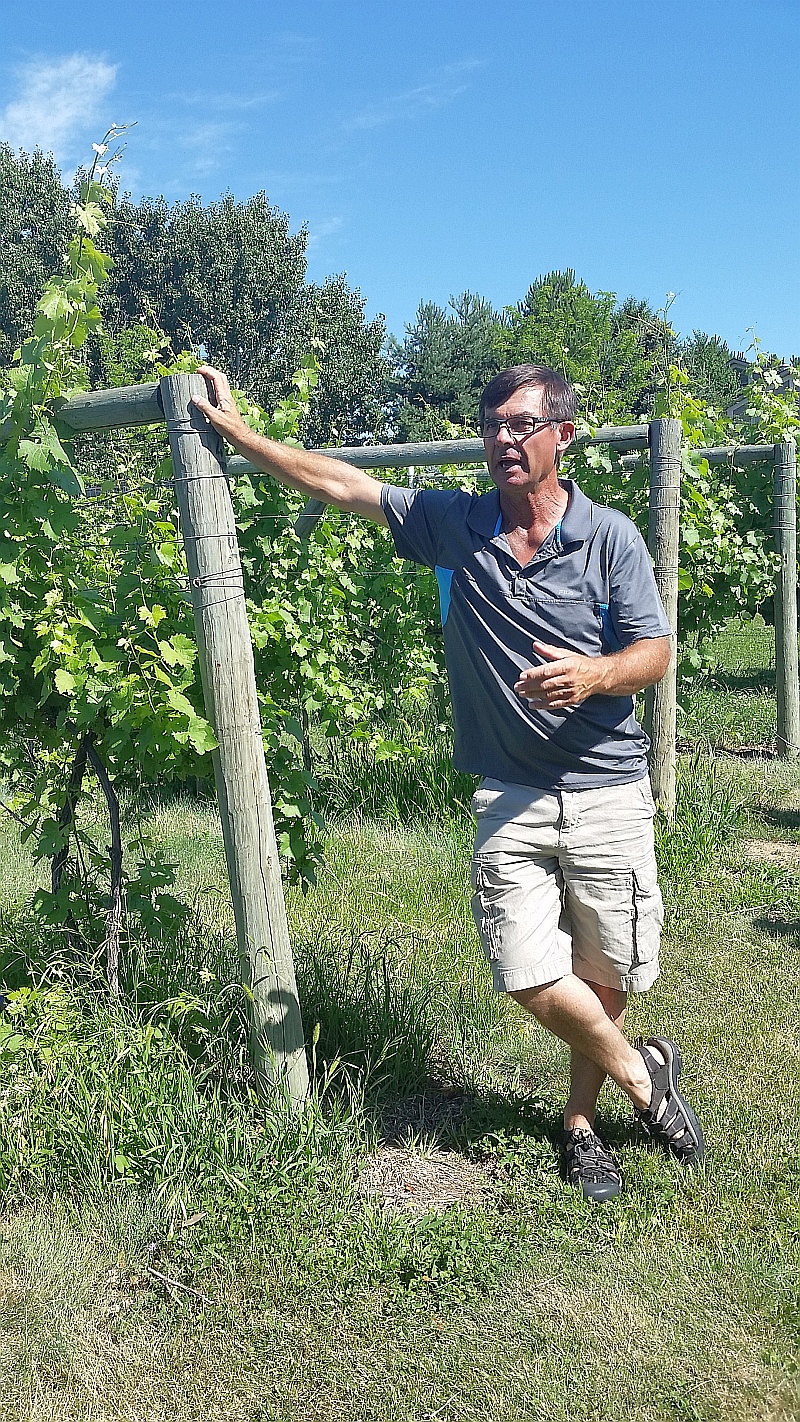 Livestock share the ranch with grape vines and wildlife. The cattle are used in the restaurant, as well as to make beef jerky that they sell in the Tasting Room. Within the 1,200-acre ranch sits 65 acres of vineyards on either side of the Thompson River, with plenty of room to expand. As I mentioned earlier Monte Creek Ranch decided to plant a significant amount of hybrid grapes, which provides insurance for risk against the cold winter weather. Erik noted that they did not have a problem with this past winter. As we walked among the vines, Erik pointed out the different varieties of grapes. The hybrid grapes, e.g. Marquette and Frontenac Gris, are prolific producers of bunches of grapes. I was quite amazed how much fruit can come from one vine.