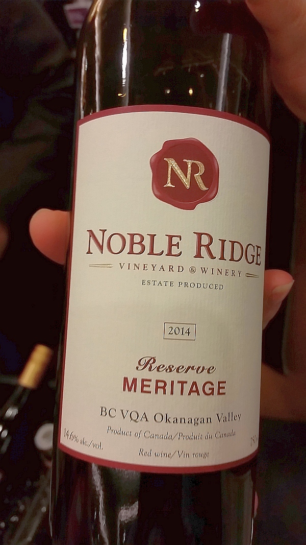 Noble Ridge Vineyard & Winery Meritage Reserve 2014 (~$27.49) – A blend of 74% Merlot, 22% Cabernet Sauvignon, 2% Cab Franc, and 2% Malbec. This wine has a light intensity, rich vanilla and red fruit nose. Ripe and round in the mouth, with a silky feel. Raspberries on the palate along with some pepperiness. Dry tannic finish.