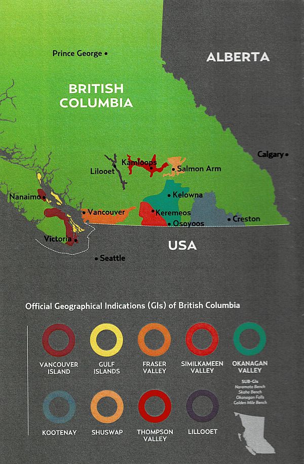 Do you know what a Geographical Indication (GI) means in the BC wine industry? According to a BC Ministry of Agriculture press release, a GI is “…a standard element of appellation systems used around the world that help people identify wines in the marketplace, provide assurance as to the origin and quality of the wine, and promote agri-tourism. British Columbia currently has six official geographical indications: British Columbia (provincial), Vancouver Island, Gulf Islands, Fraser Valley, Similkameen Valley and the Okanagan Valley…” BC now has 9 GIs.