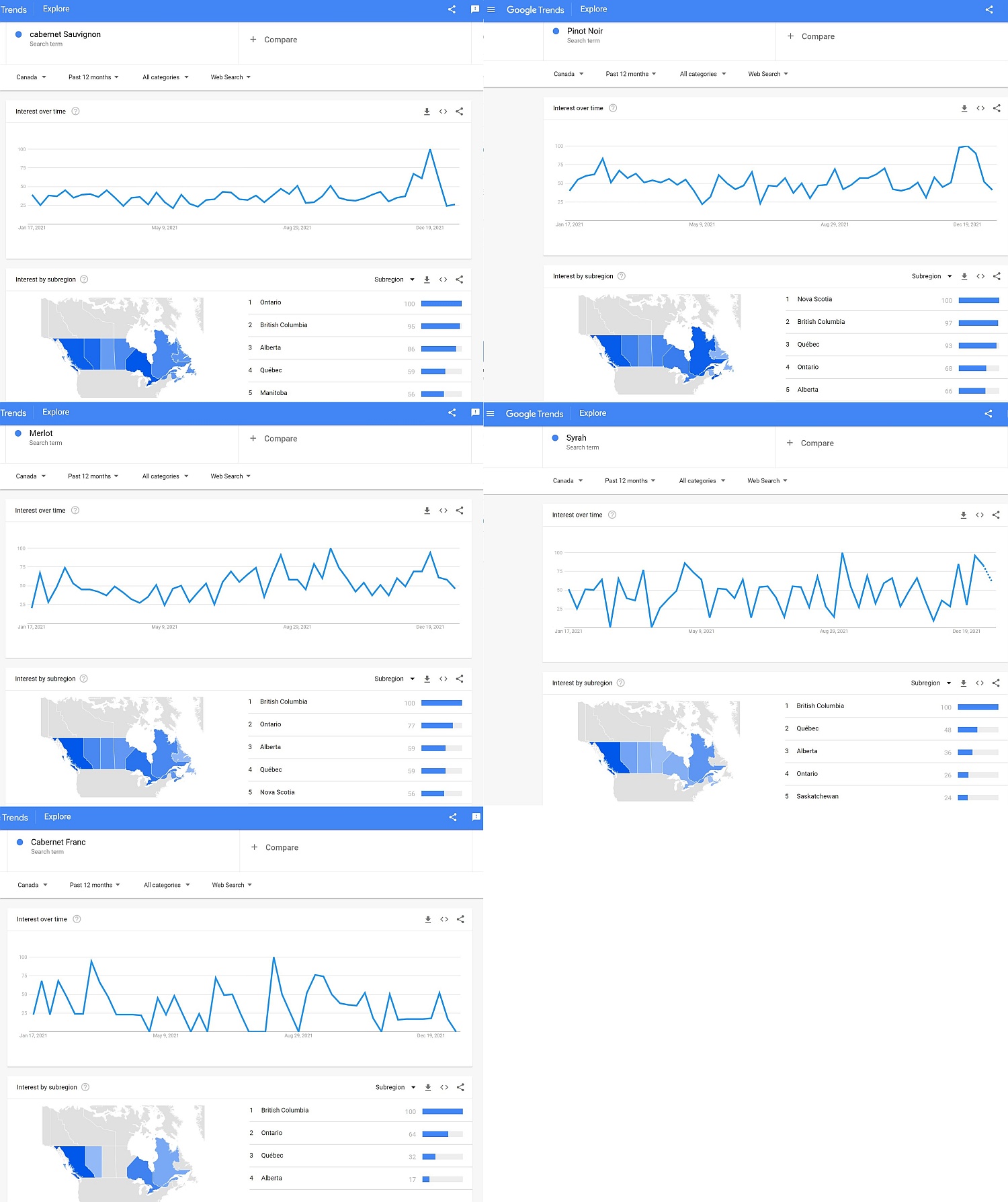 Quebec comes in with fourth-largest interest in Cabernet Sauvignon and Merlot, which was curious to me, considering these are French Bordeaux wine grapes. Maybe Quebec consumers have their favourite Cabernet Sauvignon and Merlot, and Bordeaux blends, so no need to do much research online? Or possibly, Quebecers go to their local wine shop or SAQ store and ask for recommendations more than research online.