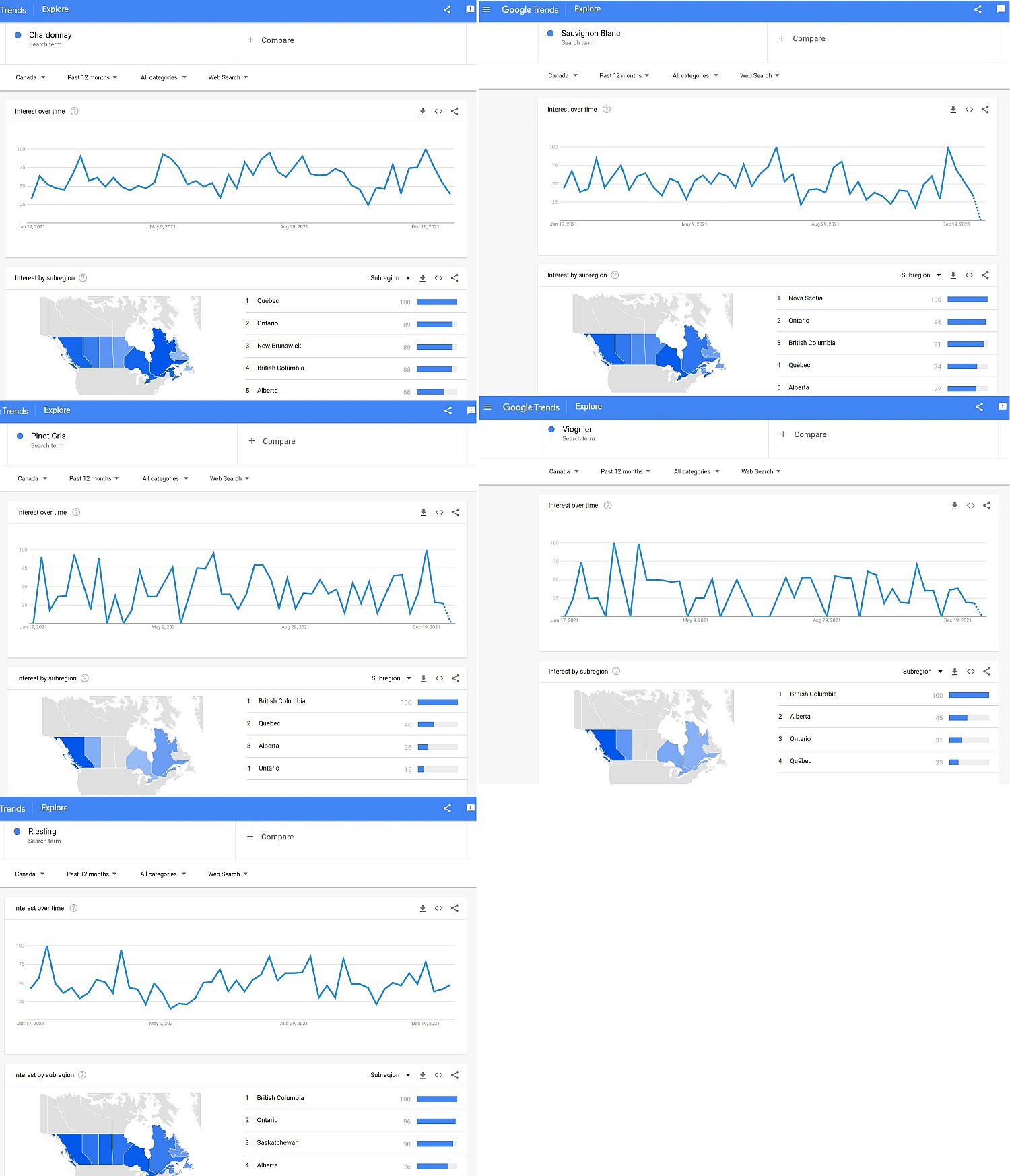 The white grapes I chose to compare are Chardonnay, Pinot Gris, Riesling, Sauvignon Blanc, and Viognier. I could have picked many others, but I thought these are more common ones across Canada. The line graphs below show our interest across 2021 by Province in each of the grape varieties. Plus there is a bar chart and coloured maps that shows which Province had the most queries about a grape variety and then the scaling of 3-4 other provinces with their level of interest. The shapes of the line graphs are interesting as well. Was there an overall upward slope (interest) in a varietal over the year? Was there a peak at a certain time of the year? Was there a downward slope (lack of interest) in a varietal over the year? Were some provinces more heavily into looking for wine?
