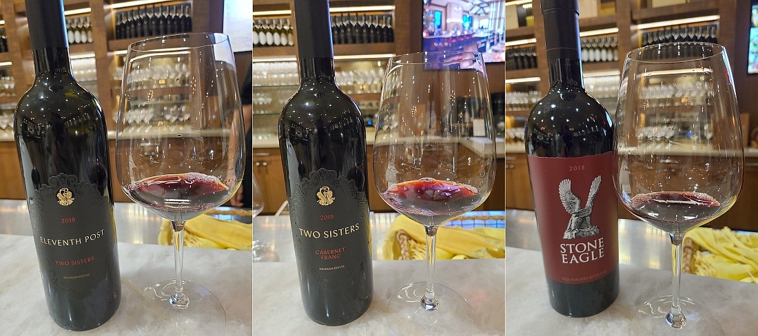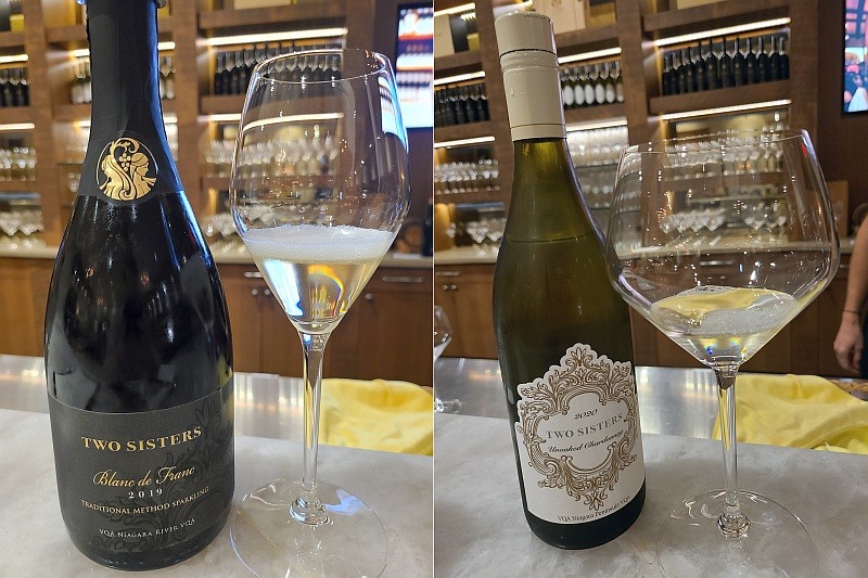 Two Sisters Vineyards by Niagara-on-the-Lake has an imposing, impressive wine-tasting room that also includes a restaurant and wine-making facilities. Driving up to the winery, I felt like I was watching the primetime TV soap operas, Dynasty or Falcon Crest. Yes, I know I am dating myself. The main Estate, which opened its doors in November 2014, was inspired by Italian Renaissance design, which was made popular by the 16th century Venetian architect, Andrea Palladio. Their vines planted include Cabernet Franc, Cabernet Sauvignon, Merlot, Petit Verdot, Chardonnay, Riesling and Sauvignon Blanc. Their winemaking team takes a low-intervention approach to wine production to deliver ultra-premium wines. They undertake sustainable vineyard management and make all their wines vegan-friendly. From their website, I can see that they have quite a wide distribution of their wines through restaurants across Ontario. Let me tell you about the wines I tasted.