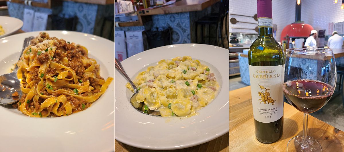 Our two pastas were the Tagliatelle al Ragù and the Tortellini alla Panna. The tagliatelle, flat noodles, were cooked al dente with the ragu sauce, a slow-cooked meat sauce made from ground beef, had deep beef flavour and was mixed in with the noodles. The amount of sauce did not completely cover the noodles, so you were able to enjoy both. Not heavy. I was quite surprised and enjoyed the Tortellini alla Panna. The tortellini were tiny and the cream, cotto ham, and peas mixture added wonderful texture and subtle flavour to this dish. Recommended. The Castello di Gabbiano Chianti Classico 2023 wine was dry with light body, medium-plus acidity, light tannins and tasty red fruit flavours. It was complementary to both of these pasta dishes, not overpowering either one.