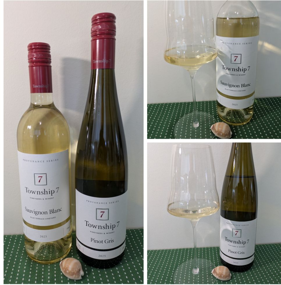 With our brilliant blue sky, green leaves on our trees opening, and robins singing, it is time to enjoy BC white wines. Here are two that I received from Township 7 Vineyards & Winery; their Provenance Series, Blue Terrace Vineyard Sauvignon Blanc 2025 and their Provenance Series Pinot Gris 2025. 2025 was a fantastic year for BC grapes and winemaking with interior vineyards having a bumper crop after the winter losses the year before. Here are my tasting notes for these two BC wines.